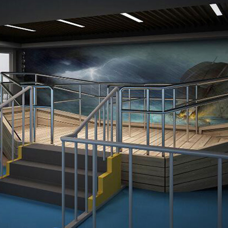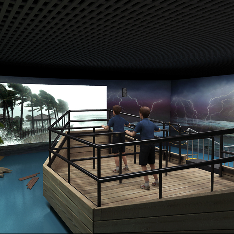 臺(tái)風(fēng)館采用先進(jìn)的多媒體技術(shù)以及和實(shí)景相結(jié)合的逼真效果來模擬臺(tái)風(fēng)發(fā)生時(shí)的情景。